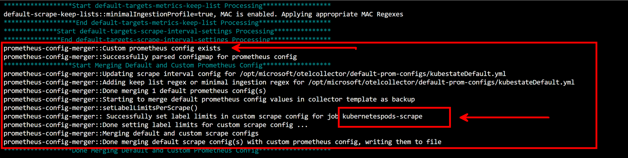 If you run a kubectl logs command on that pod, you will find the following log message showing the scrape job was configured: