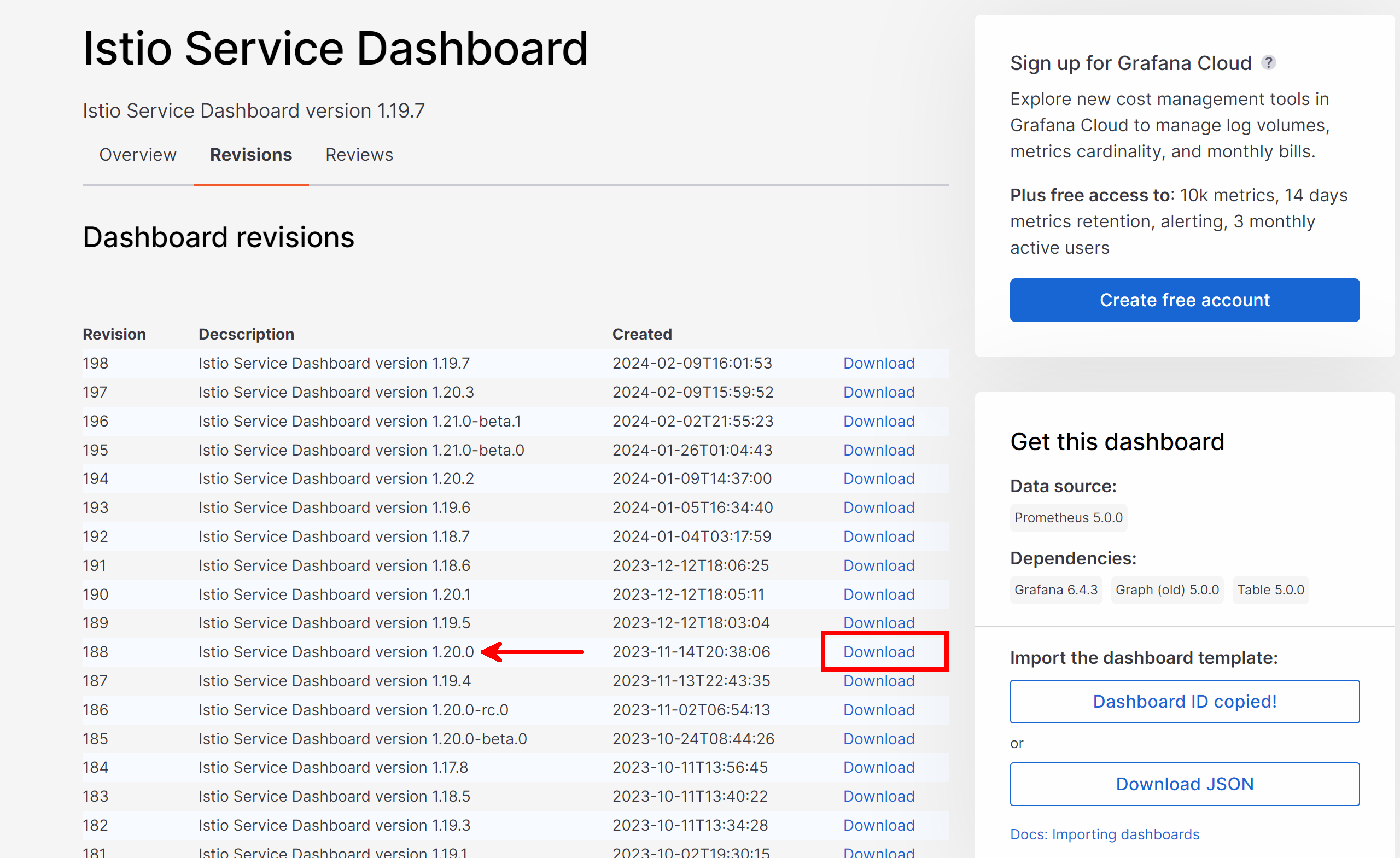 I'll start with the Istio Service Dashboard. We can simply copy the ID to our clipboard and then import the ID in our Grafana instance. Alternatively to correspond to our version, we can select Revisions and download the JSON that matched our Istio Version. I'll take the second path: