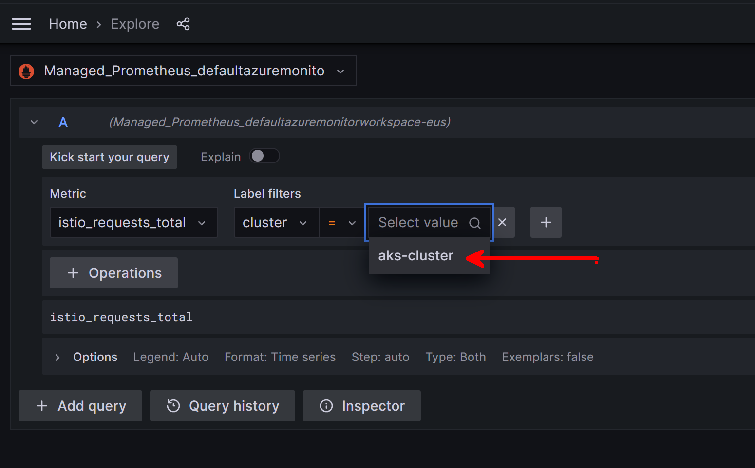 There are many ways to address this. You could simply configure each cluster to use a different Azure Monitor Workspace, but that isn't really necessary. Another way is let's add a filter to further specify the query.