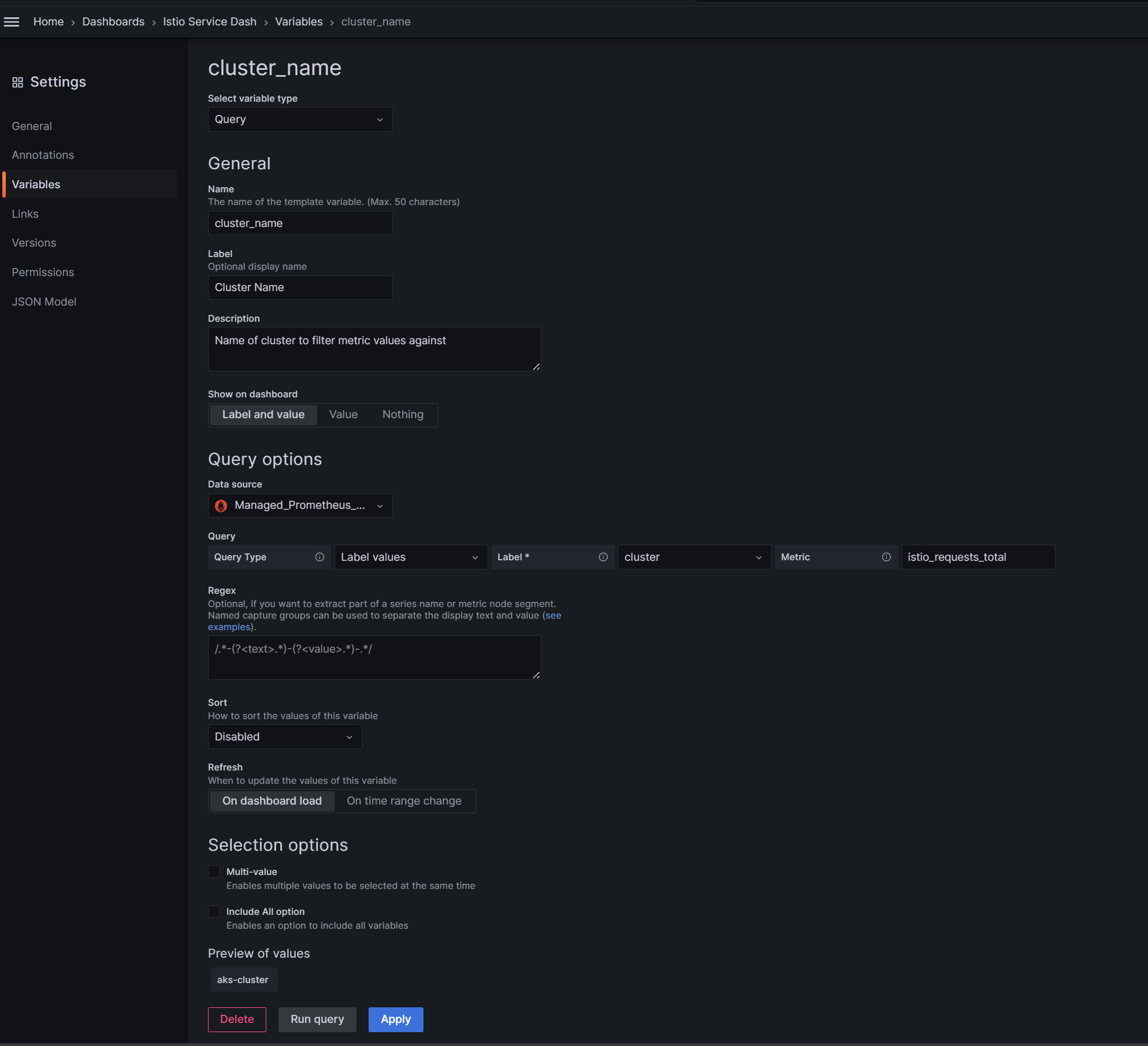 Therefore, I could use this label to filter the metrics by each cluster if desired. I would need to add a variable to the dashboard and then use it in the queries. Here's what that could look like, and again you can customize or do it differently as needed.