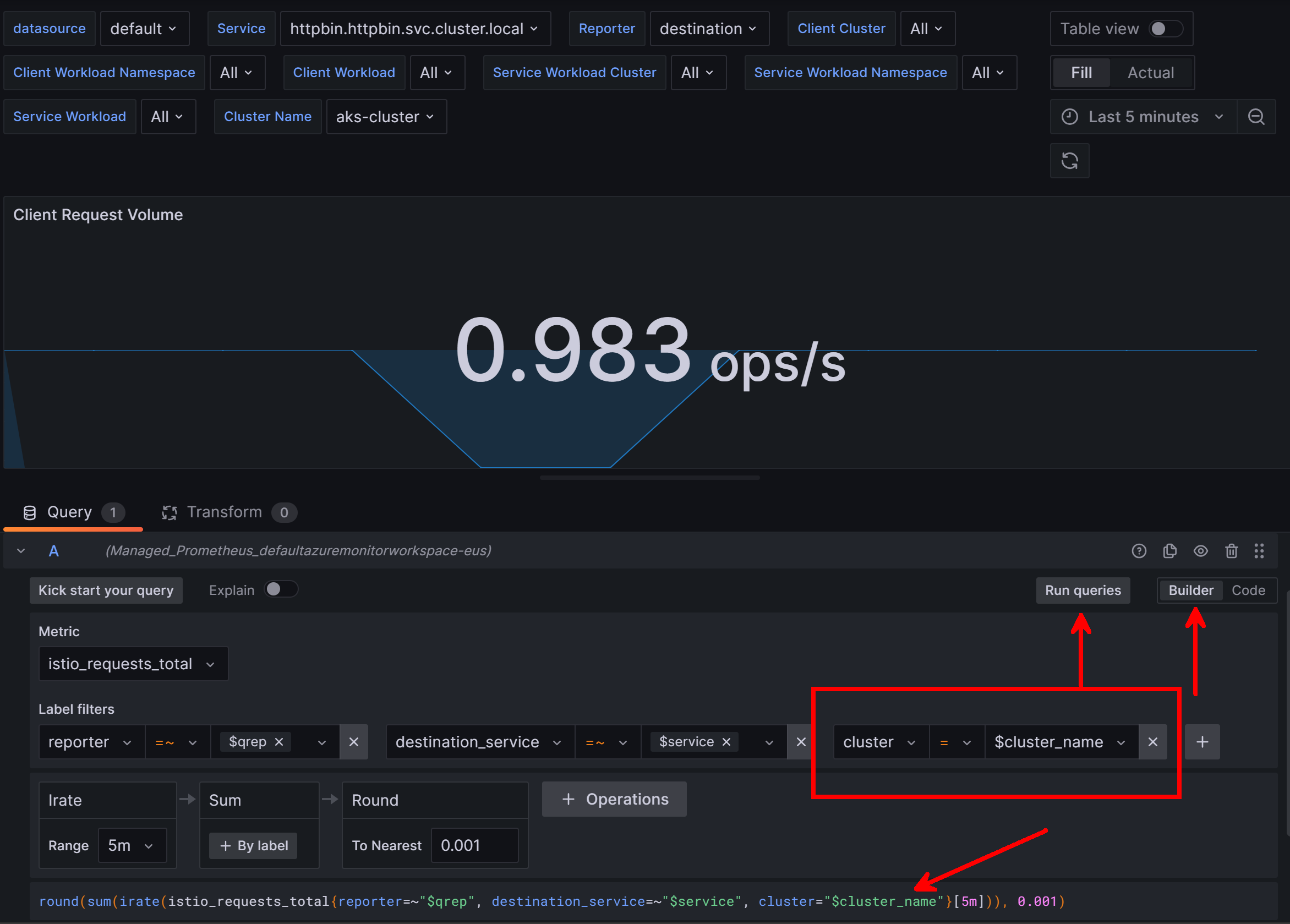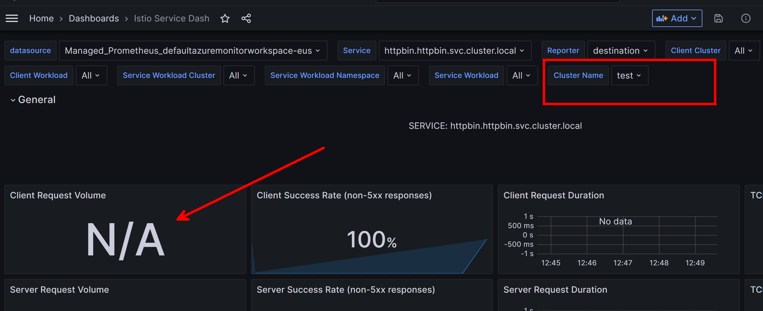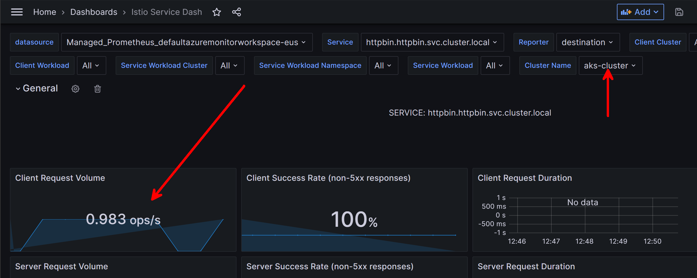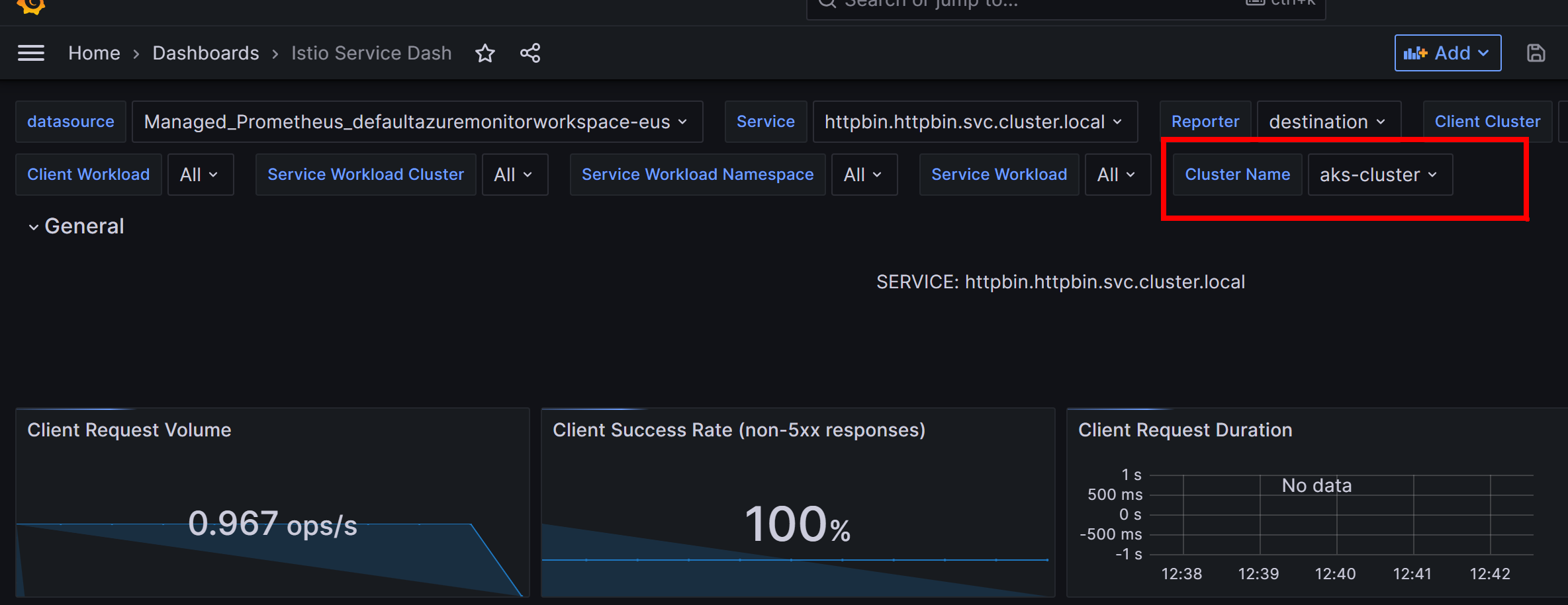 If we consider our example, what would happen if I deployed the exact same httpbin service to another AKS cluster and linked that cluster to the same Azure Monitor Workspace? Basically the results would be double, since the names of the gateway and backend service would exactly match and there isn't a clear filter on how to say "cluster 1" versus "cluster 2".