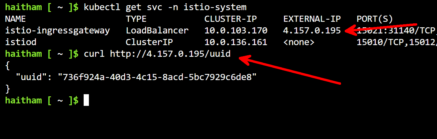kubectl apply -f https://raw.githubusercontent.com/istio/istio/master/samples/httpbin/httpbin-gateway.yaml -n httpbinAs a check, you can get your ingress gateway IP and run a curl. The httpbin pod has a /uuid path that will return a randomly generated uuid: