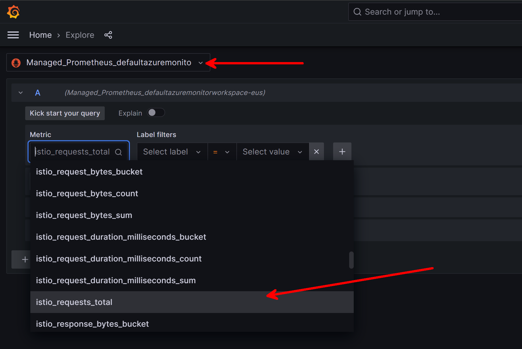 Navigate to the Explore tab from the home page and you should then see a number of envoy and istio metrics: