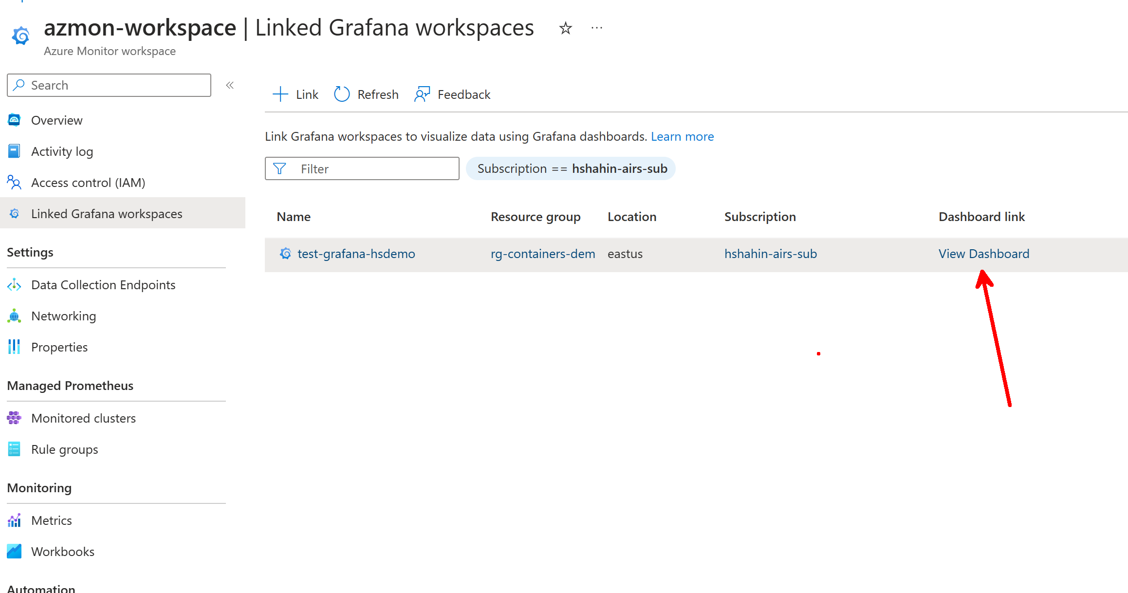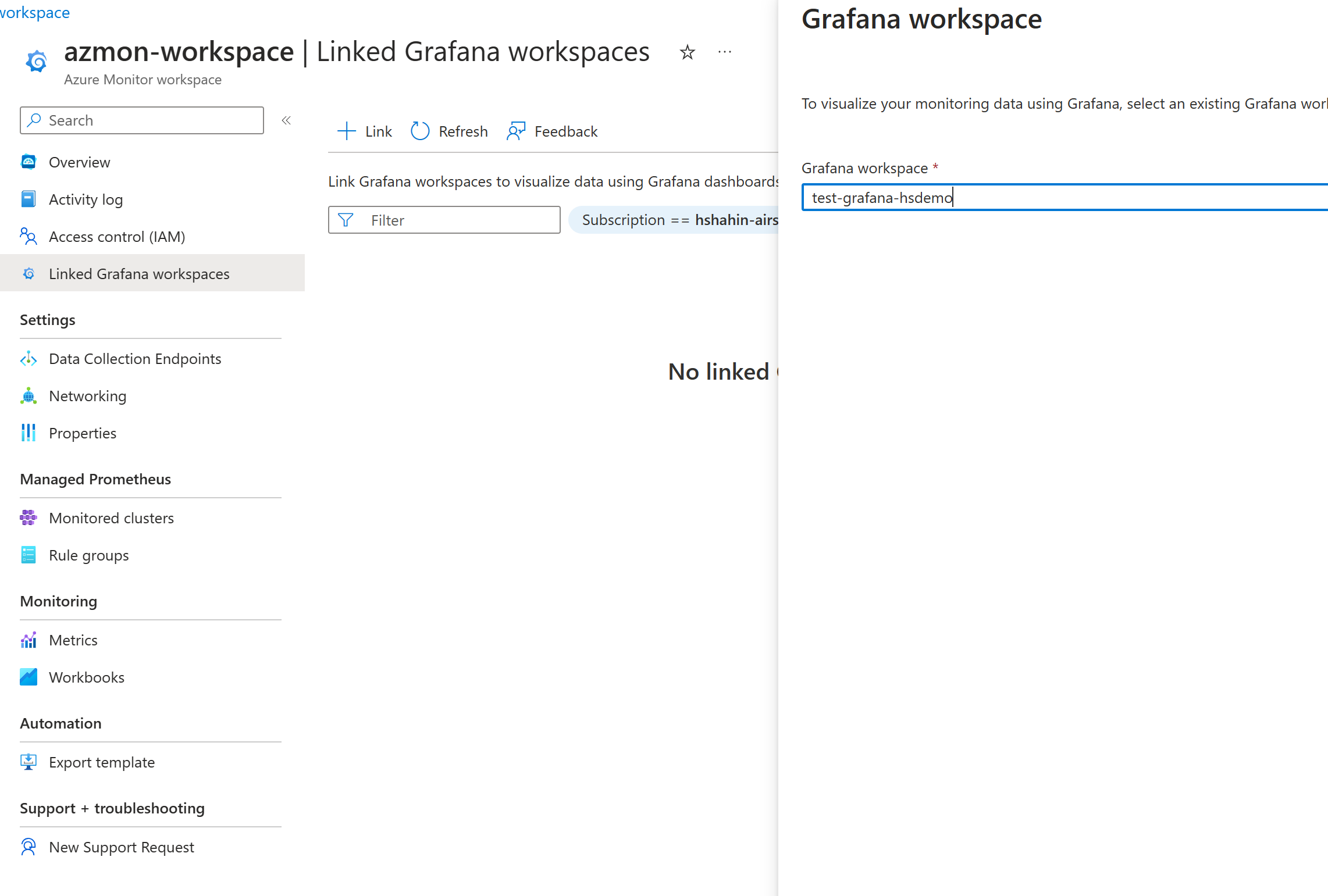 Once it deploys, you can return to your workspace and link the workspace with the Grafana instance: