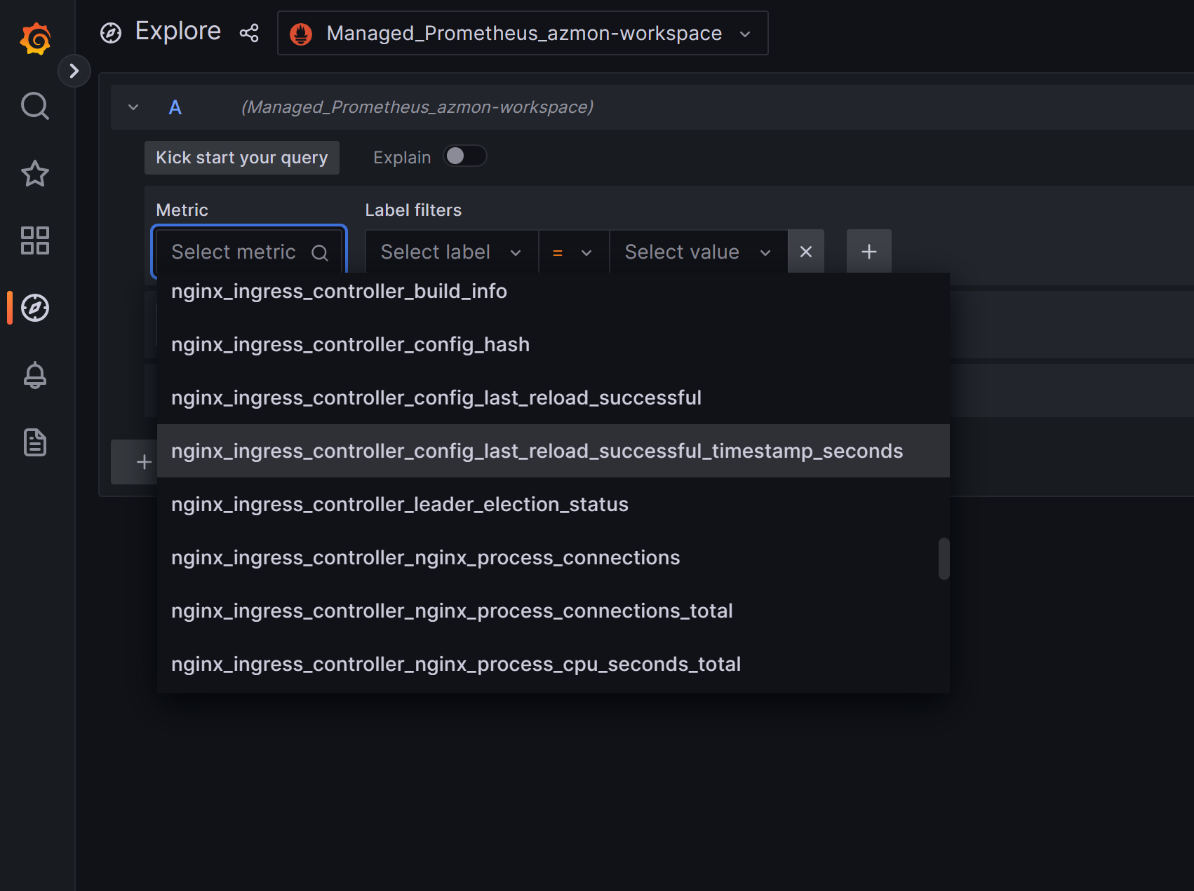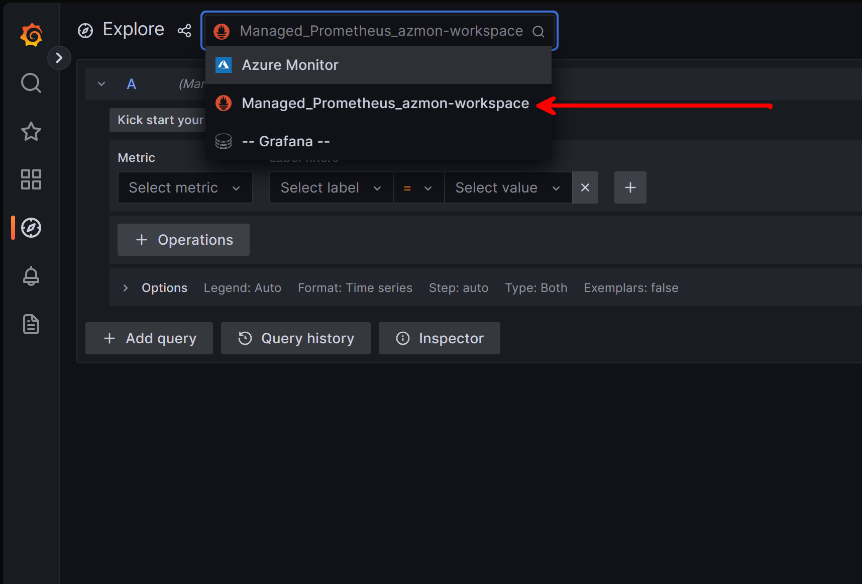 After you click on explore, you can create a query. First, make sure that the Grafana datasource is configured to your managed Prometheus workspace:
