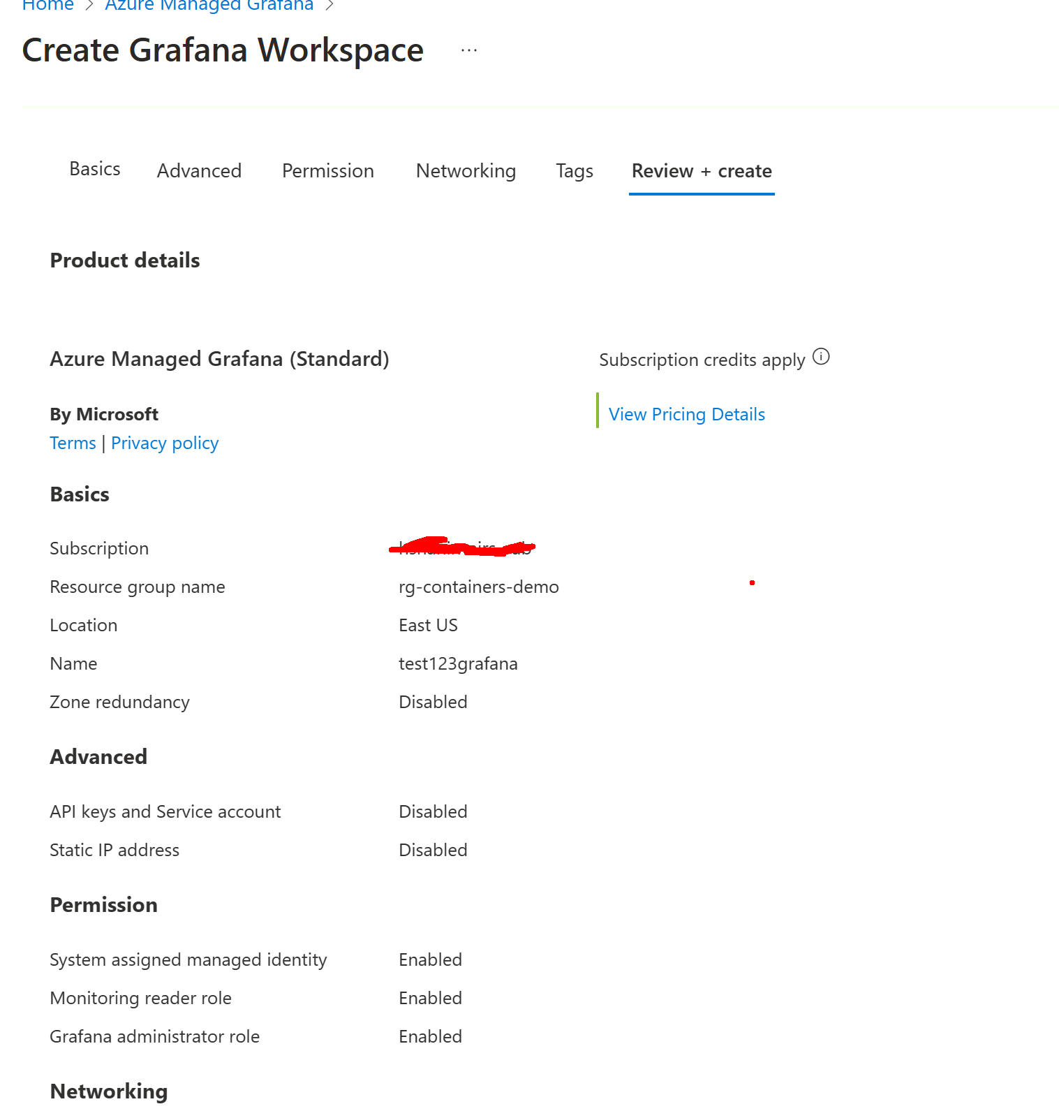 Let's create a Grafana instance and link it to the workspace - you can leave all the defaults: