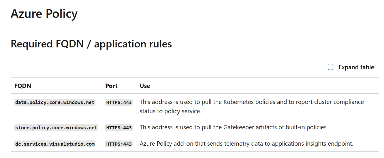 These Azure Policy pods run in a distinct gatekeeper-system namespace and require outbound access to the following FQDNs to report back compliance: