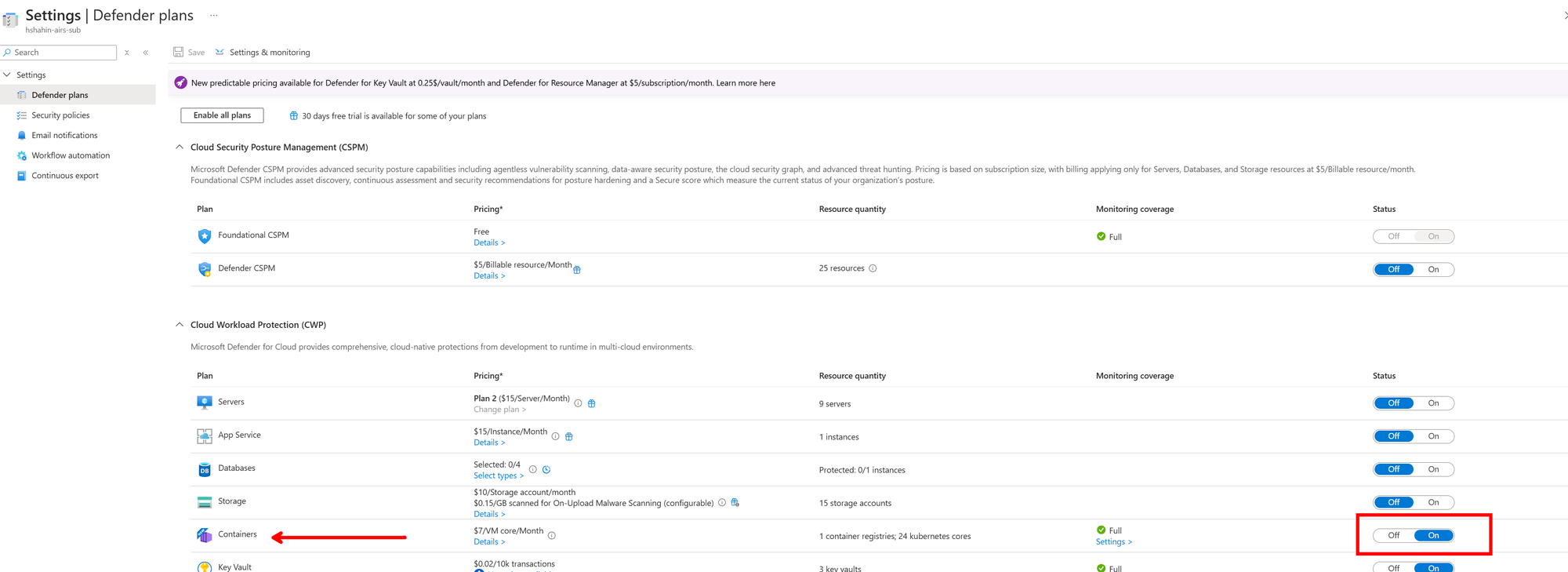 Next, simply turn on the Defender for Containers line item to get all these capabilities.