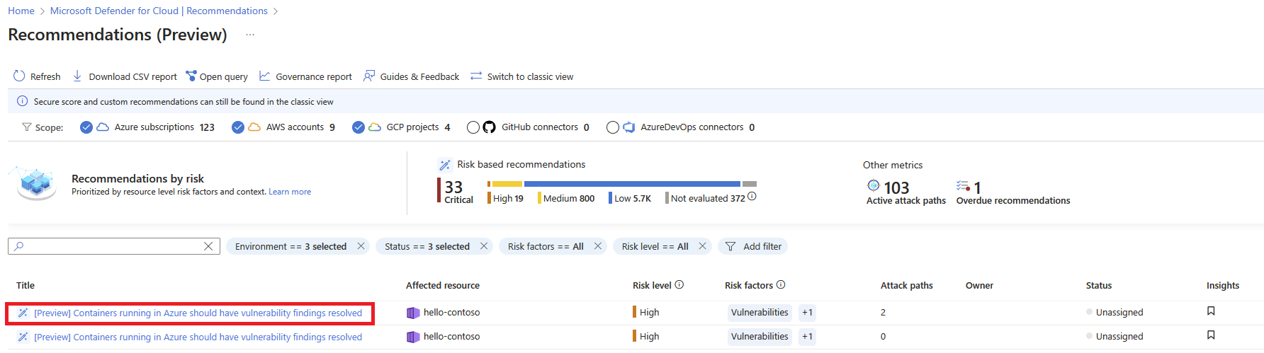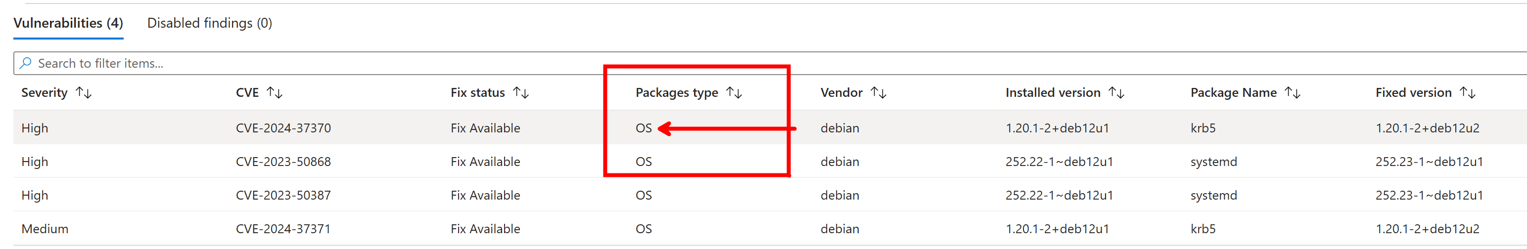 When you turn it on, you will be able to ineract with the output of the scans through the UI and through Azure Resource Graph queries. You can select on particular images, view each discovered CVE by severity, and then view known remediations and package fixes: