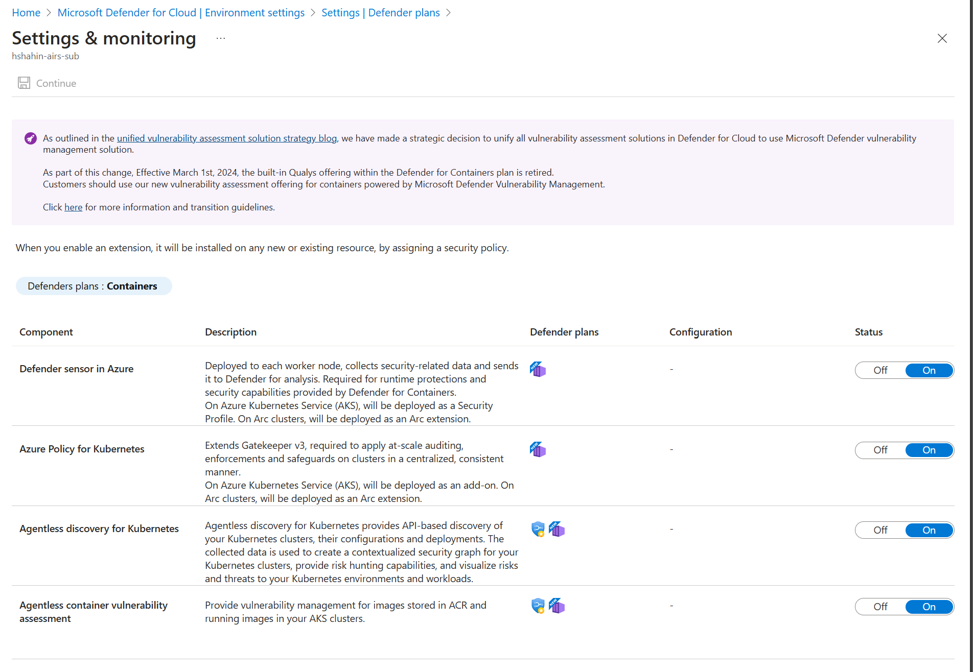 Next, on the Defender plans page, select On to enable all capabilities for every cluster within the subscription.