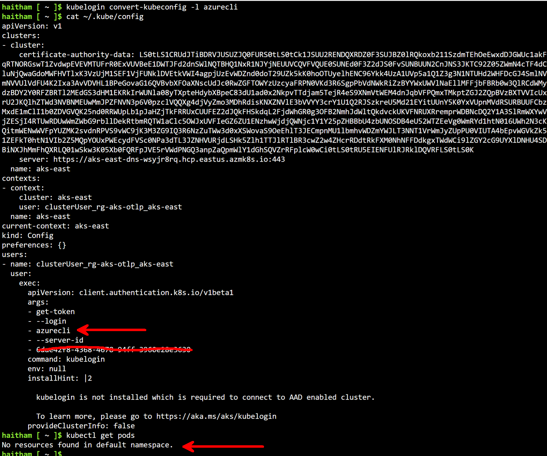 Kubelogin has different login modes which you will need to review so that you can use the proper one for the environment you're working in. For example, by default as you can see in the kube-config file above, it defaults to a devicecode login. However, since I'm already running with the AZ CLI meaning I should already have an access token in my shell, I can run the convert-kubeconfig file to the azure cli login mode, which will use the already logged-in context when obtaining a token to pass to AKS: