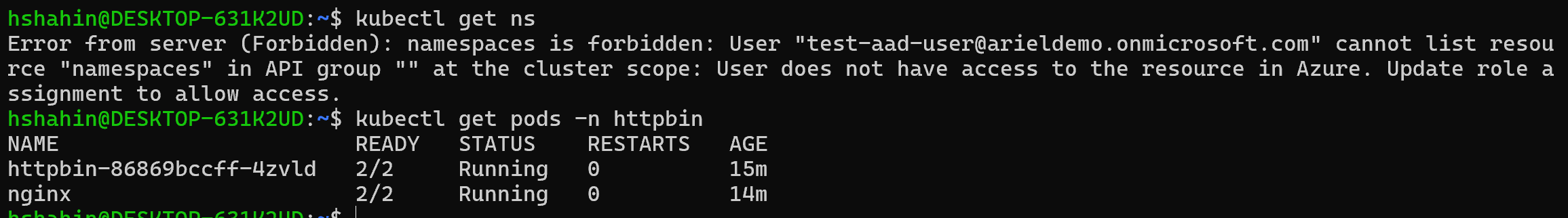 az role assignment create --role "Azure Kubernetes Service RBAC Writer" --assignee OBJECT-ID --scope /subscriptions/SUBID/resourceGroups/rg-aks-otlp/providers/Microsoft.ContainerService/managedClusters/aks-east/namespaces/httpbinAfter this is applied, let's re-run the commands from above to see what I can do. Keep in mind that I have not yet removed the cluster-wide Reader role, so at this point the test-user has two permissions, Reader at cluster-scope and Writer only on the httpbin namespace: