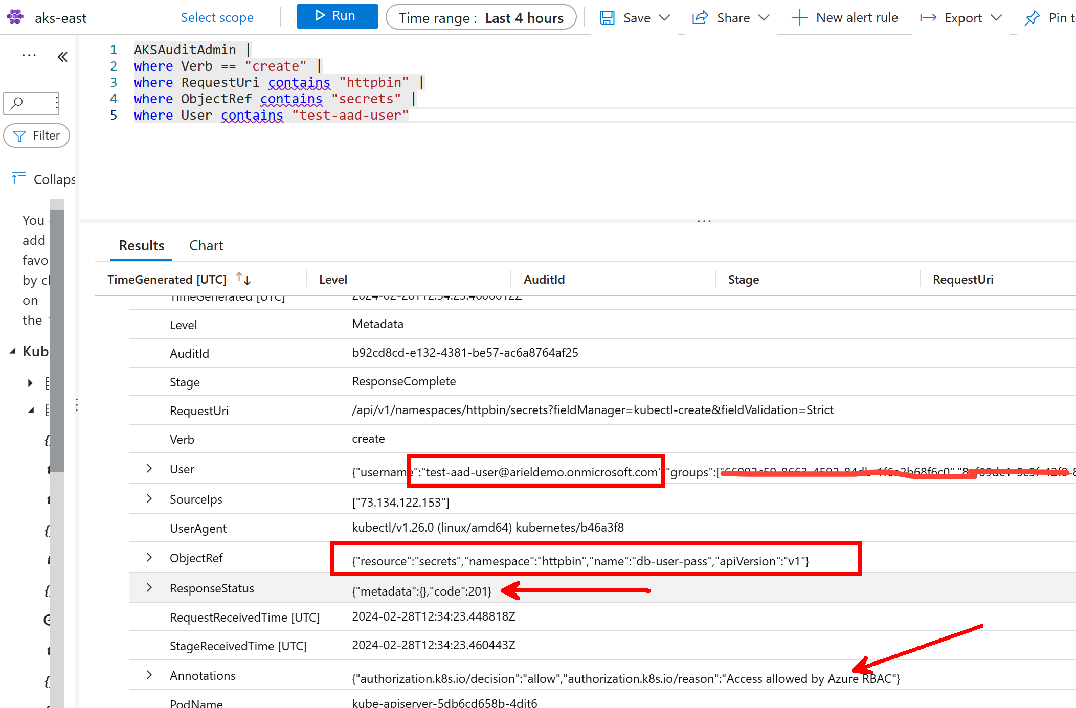 Beyond the natural security benefit of integrating with AAD for authentication, we also now have the ability to audit and see who is doing what within the cluster through the AKS Diagnostic Logs, specifically the kube-audit-admin table (which is a subset of kube-audit that will ignore gets and lists). In the examples above, you'll notice for example that the test-user at one point made a secret within the httpbin namespace called db-user-pass. Let's see if we can see that in the logs.